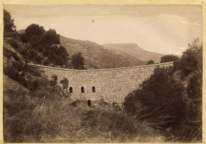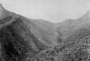 En la imagen de la izquierda instalación de faginas en el barranco de Leyva en Sierra Espuña para evitar la erosión de las laderas, 1900. En la imagen derecha dique Cabezo del Aire en Huerta Espuña, 1895.